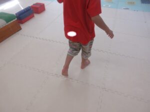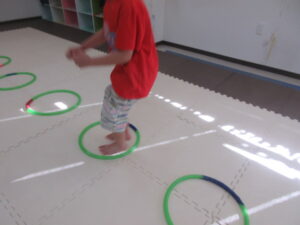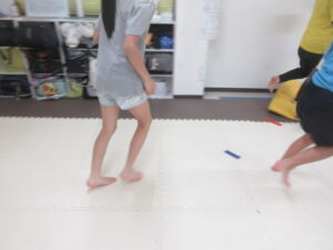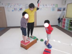 足をそろえて。グージャンプを練習中のお友達も、先生とたくさん練習して