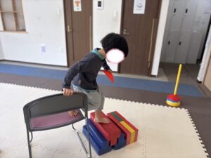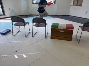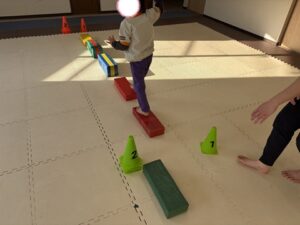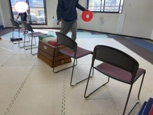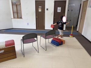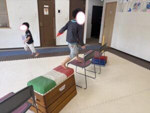 コーンを持って椅子と跳び箱の上を走り抜けよう!!