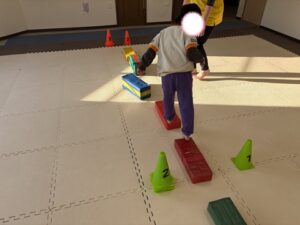 平均台の上を歩き続け、端まで行ったらコーンを動かします。