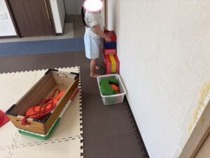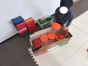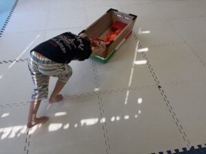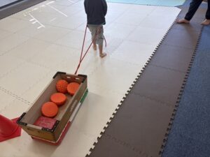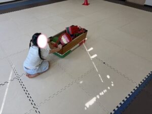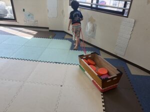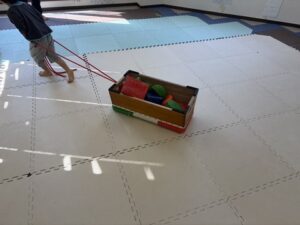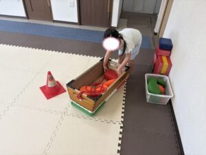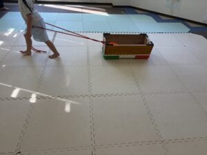 どれか一つだけ、跳び箱の中に入れて今度はロープの中に入って跳び箱を引こう!