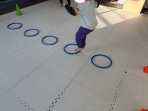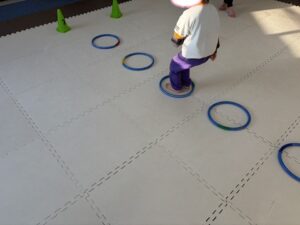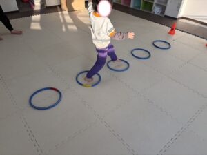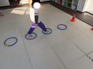 フープの中に着地できるようにゆっくり丁寧にグーパージャンプで進もう!