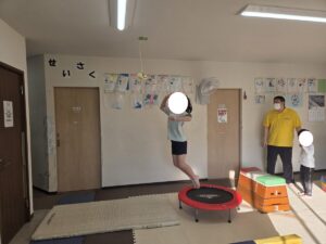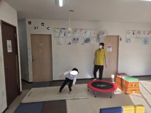 跳び箱に跳びのってトランポリンにジャンプしてからの