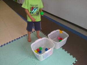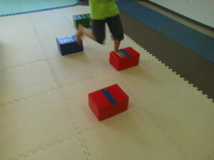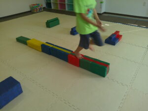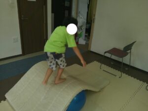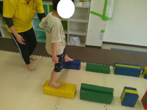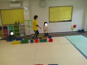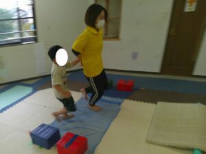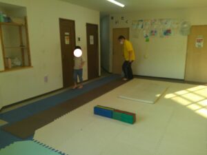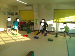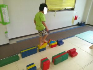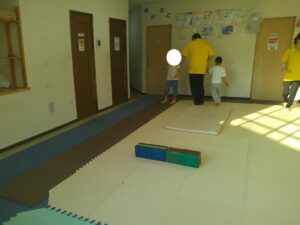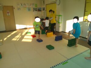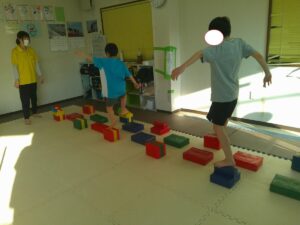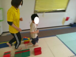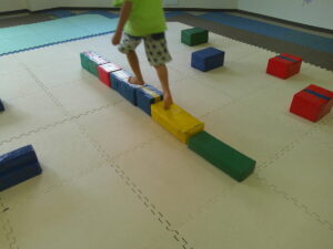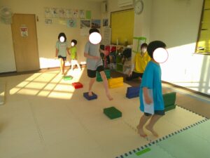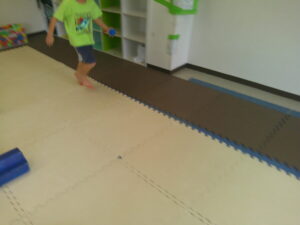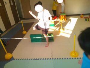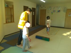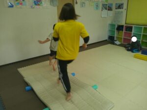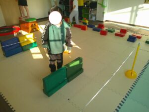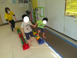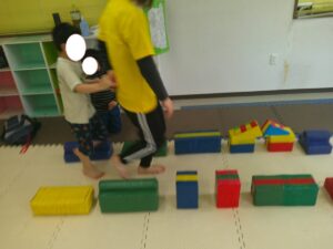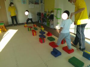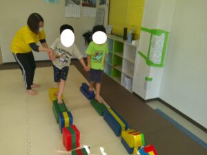 小さな平均台を進んでいく事に挑戦するお友達や