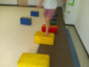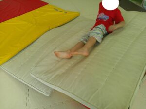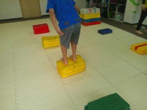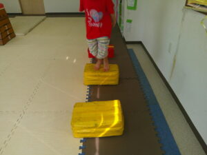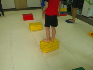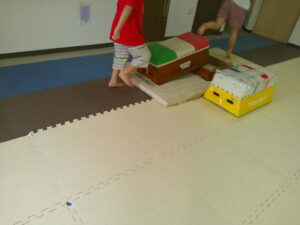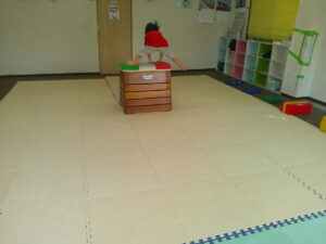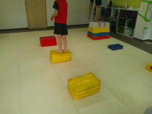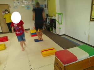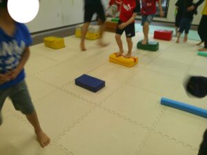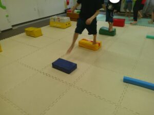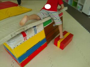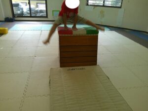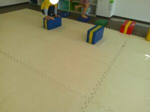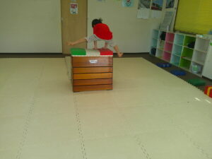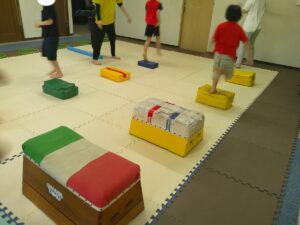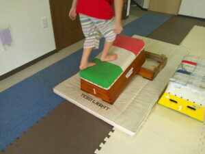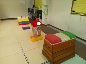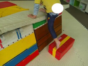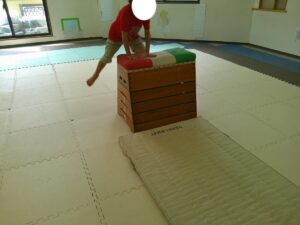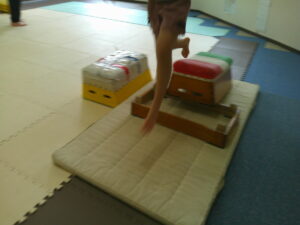 小さなお友達は跳び箱に乗ったら平均台を2個跨いで走ろう✨