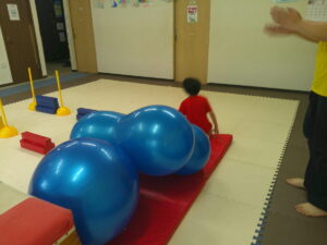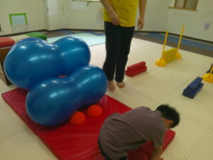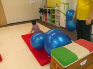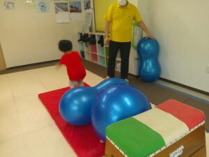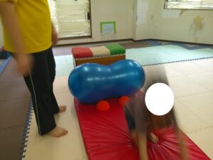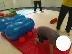 いつもの坂道と異なりやわらかいバランスボールのお山だったので