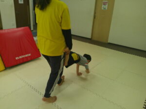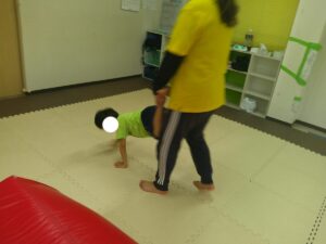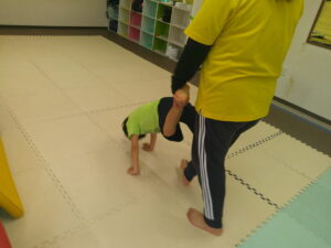 先生に足を持ってもらい、手押し車で教室の反対側まで進もう!