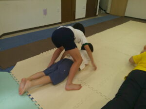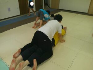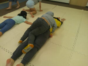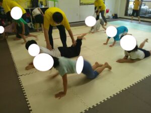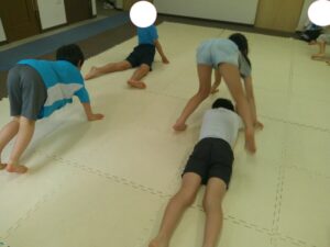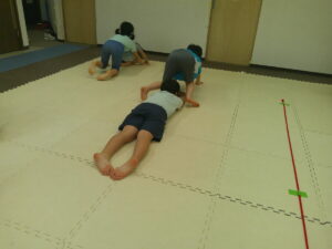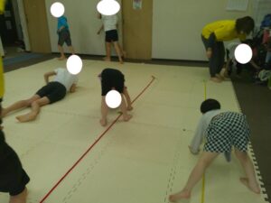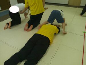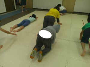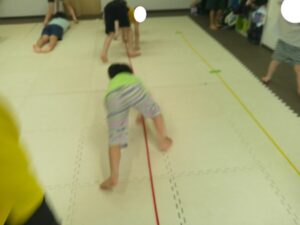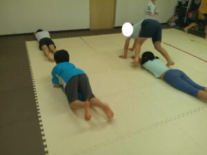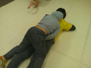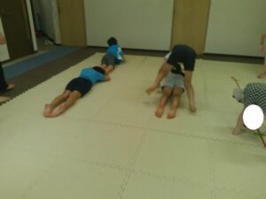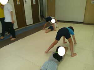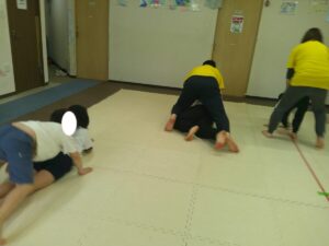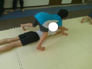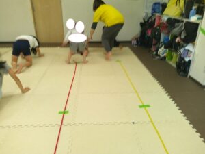 一人がうつ伏せになっている上をもう一人のお友達はクマで進もう✨