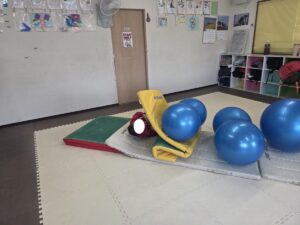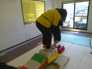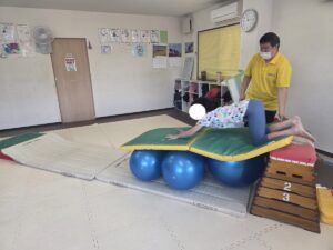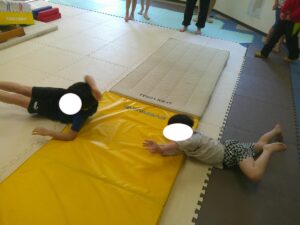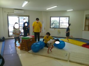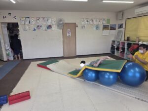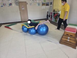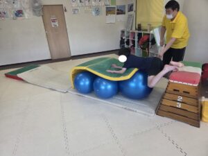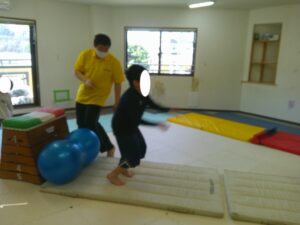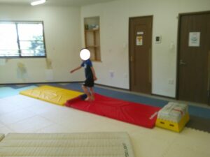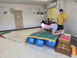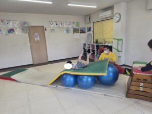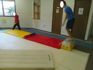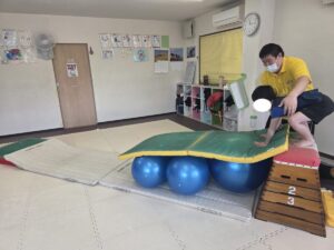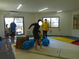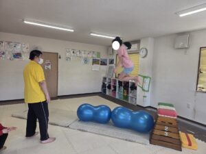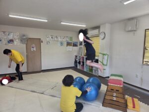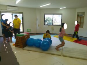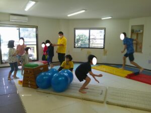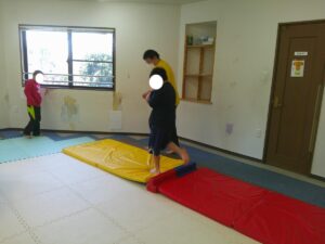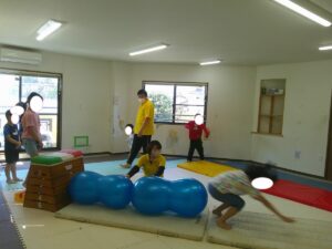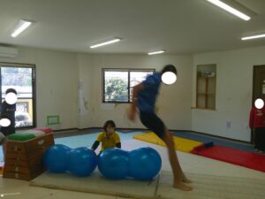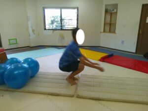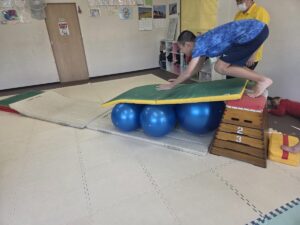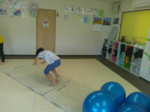 バランスボールを敷いたマットの上に飛び込んで楽しもう☆
