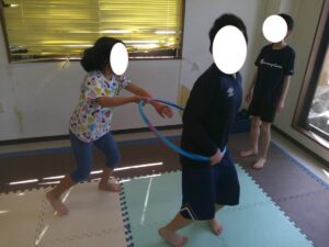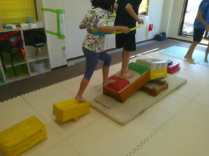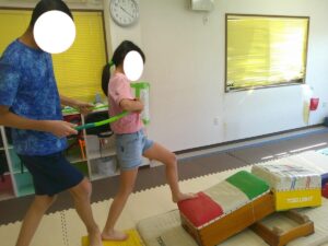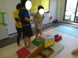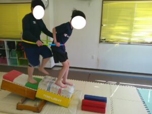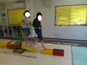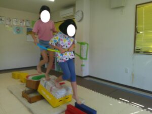 帰りはフープに二人で入って平均台を歩いて戻ろう!