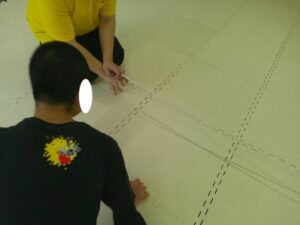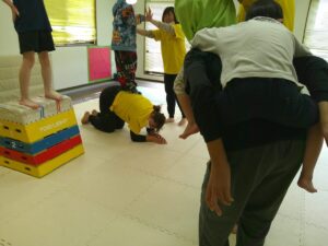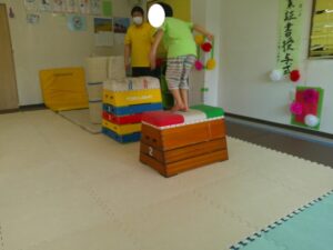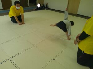 1つ目の活動は「マット 台上前転」