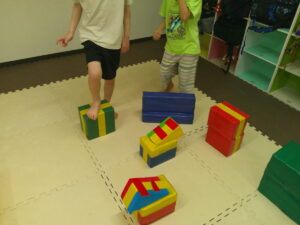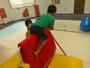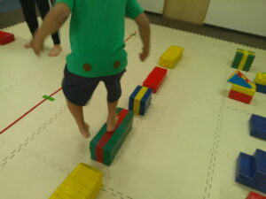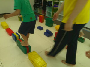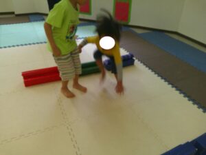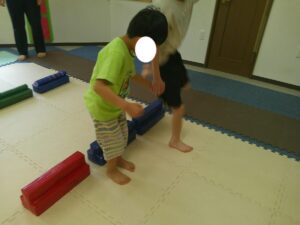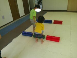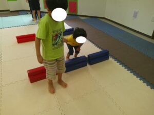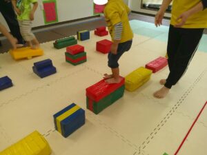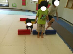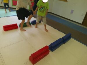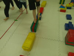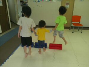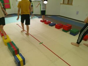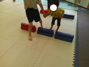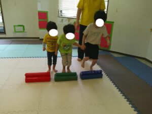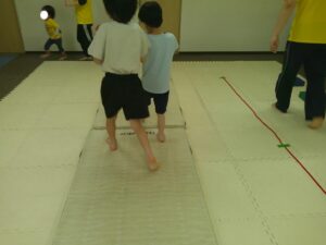 ペアになって平均台を手を繋いで、ジャンプしながら進むよ(^^)(^^)