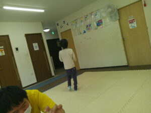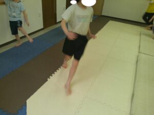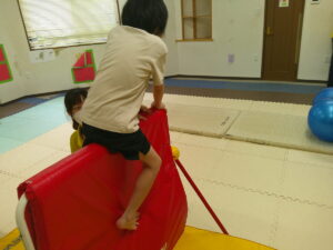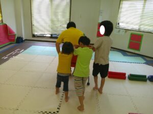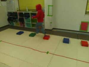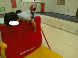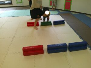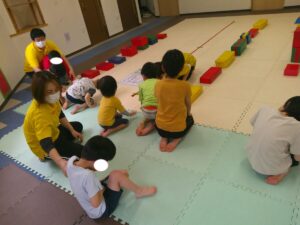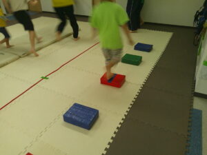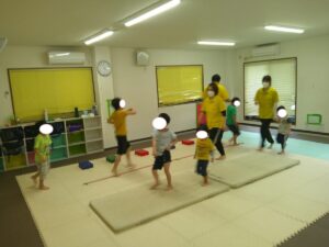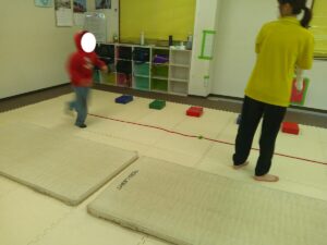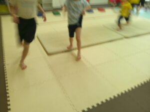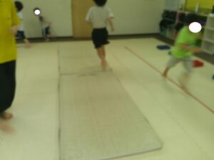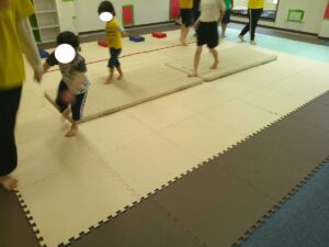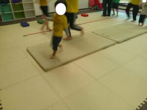 マットの上を走るお友達、平均台の上を走るお友達に分かれて活動するよ(^^)/