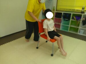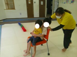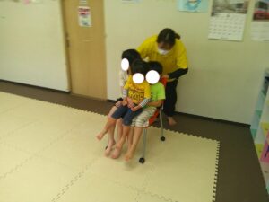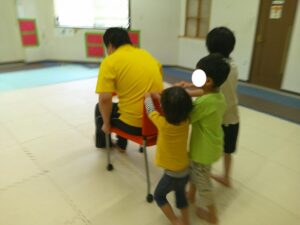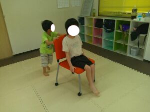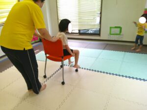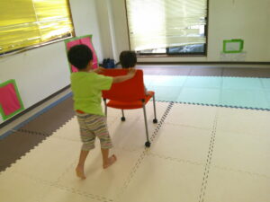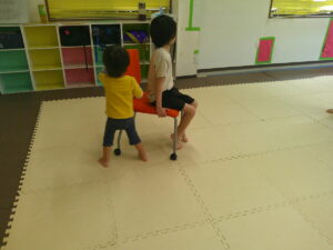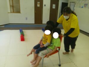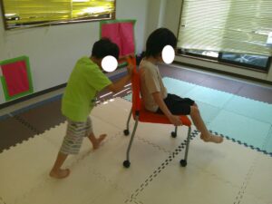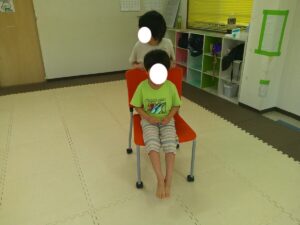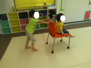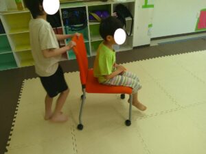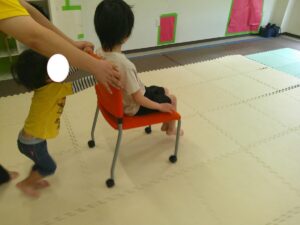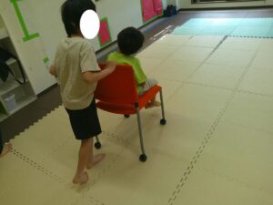 反対側まで進んだら、二人で椅子に座るお友達、押して進むお友達に分かれて