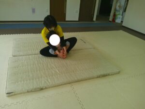 身体を揺らしたり、お山座りのポーズでストレッチをしたら