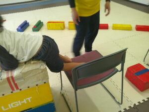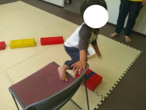 イスと平均台を歩いて進んだら洗濯ばさみを1つ持って