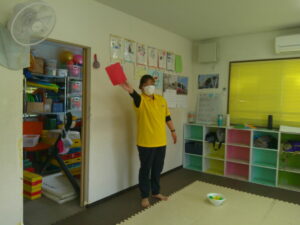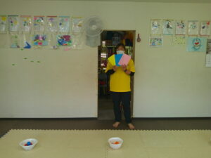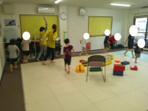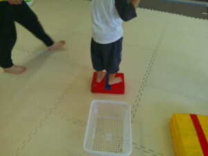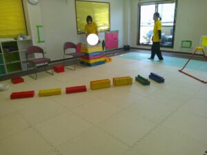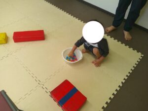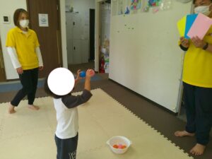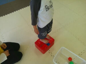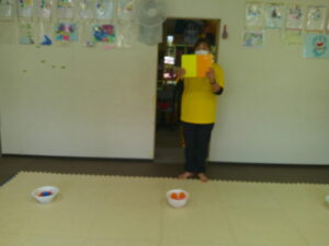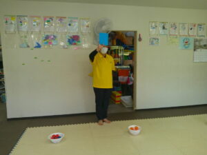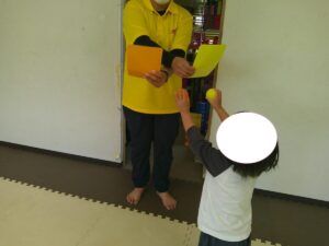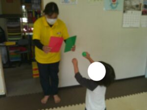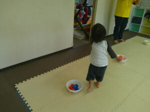 先生が色のカードを見せてくれるので同じ色のボールを運んで